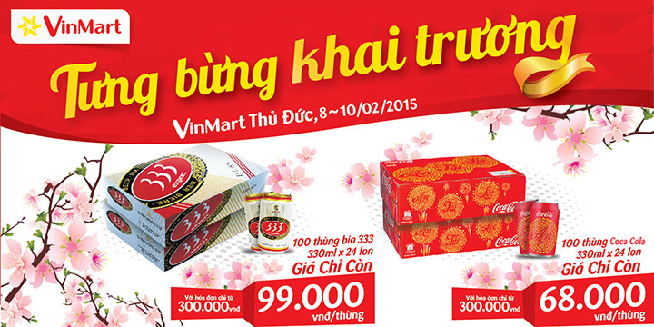 Đặc biệt cho dịp khai trương, 200 thành viên đầu tiên có hóa đơn mua hàng từ 300,000 đồng trở lên tại VinMart sẽ được mua 1 thùng Coca Cola (330ml x 24 lon) giá chỉ 68.000 đồng hoặc 1 thùng bia 333 (330ml x 24 lon) giá chỉ 99.000 đồng. VinMart cũng đồng thời áp dụng Chương trình Giá sốc Khuyến mãi trong suốt tuần lễ khai trương từ 08~17/02/2015 cho tất cả khách hàng: Với mỗi hóa đơn mua sắm tối thiểu từ 300,000 đồng, khách hàng có cơ hội được mua 1 thùng Coca Cola giá còn 159.000 đồng hoặc 1 thùng bia 333 giá còn 199.000 đồng.