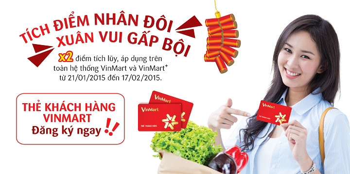 Khách hàng thành viên còn được nhân đôi số điểm tích lũy khi mua sắm tại siêu thị VinMart và cửa hàng tiện lợi VinMart trong thời gian từ ngày 21/01/2015 đến hết ngày 17/02/2015. Mua sắm càng nhiều, tích lũy điểm càng cao.