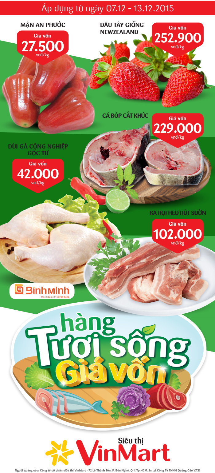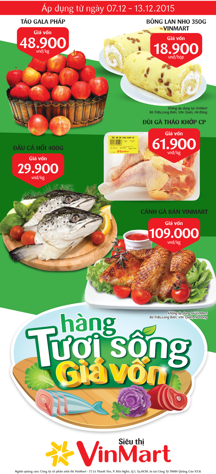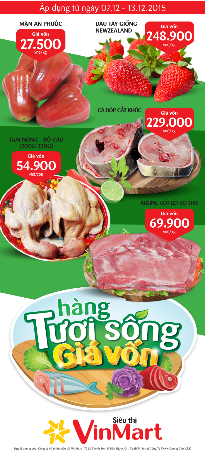 Chương trình "Giá sốc hàng tươi sống" áp dụng tại hệ thống các siêu thị VinMart từ ngày 07/12/2015 đến 13/12/2015 với nhiều sản phẩm ưu đãi, giảm giá cực hấp dẫn khác nhau.