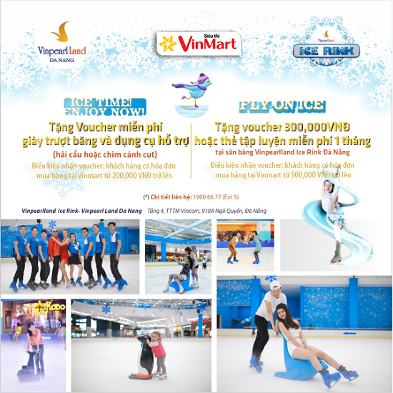 Hai chương trình khuyến mãi lớn áp dụng tại VinMart Đà Nẵng, Chương trình: “ICE TIME! ENJOY NOW!” tặng ngay Voucher miễn phí giày trượt băng và dụng cụ hỗ trợ và chương trình: “FLY ON THE ICE” tặng Voucher 300.000đ hoặc tặng thẻ tập luyện miễn phí 1 tháng Silver tại sân băng Vinpearlland Ice Rink Đà Nẵng. Thời gian áp dụng từ ngày 02/12/2015 đến ngày 15/12/2015.