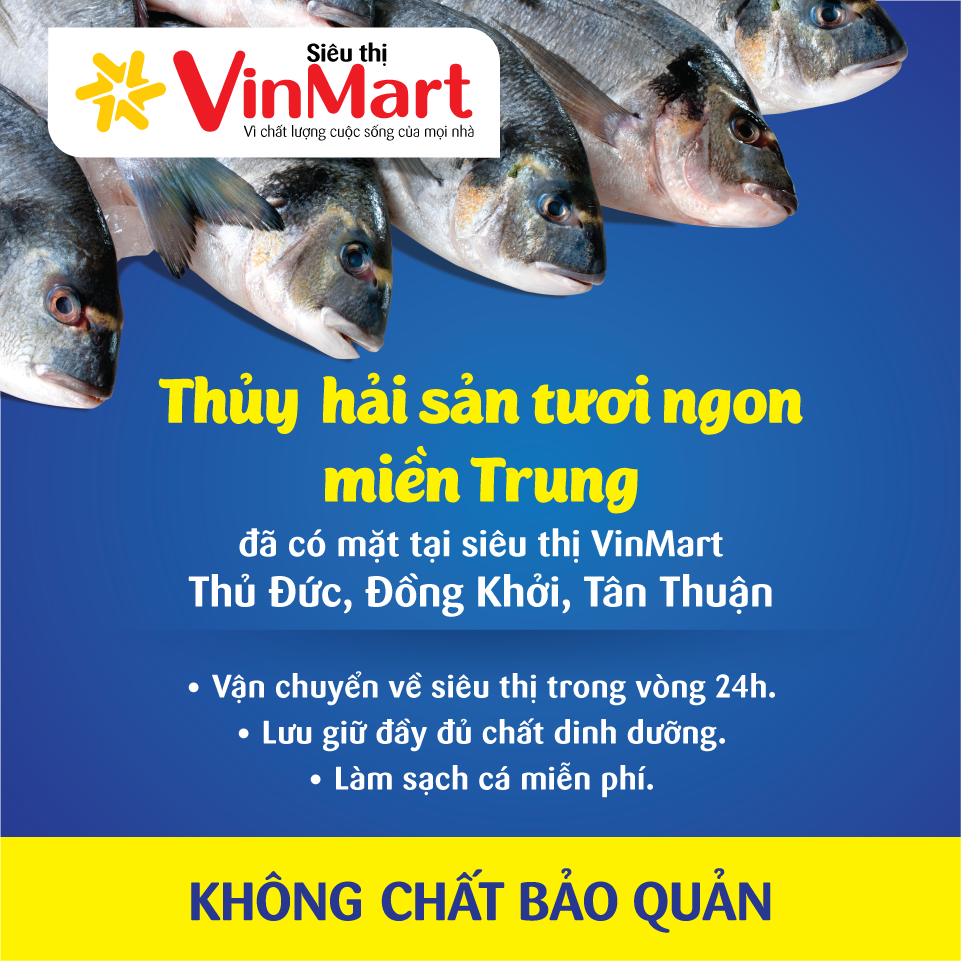 Từ ngày 12/12/2015 tại các siêu thị VinMart Thủ Đức, Đồng Khởi, Tân Thuận chính thức bán các sản phẩm thủy hải sản các loại cá, mực tươi lấy trực tiếp từ người dân đánh cá ngoài biển để nhập về siêu thị, đảm bảo không chất bảo quản, không ướp hóa chất, giữ đầy đủ chất dinh dưỡng trong thủy hải sản, được bảo quản kỹ bằng đá và nilon trong 24h.