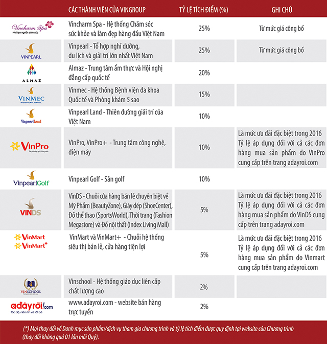 - Mọi thay đổi về Danh mục sản phẩm/dịch vụ tham gia chương trình và tỷ lệ tích điểm được cập nhật tại website vingroupcard.net (thay đổi không quá 01 lần mỗi quý)